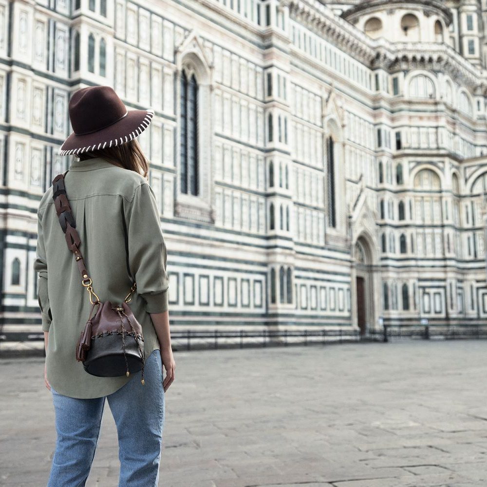 A bag that seems to invite you to admire the panorama of Brunelleschi’s dome through its pattern. The color also conjures up the image in some way.