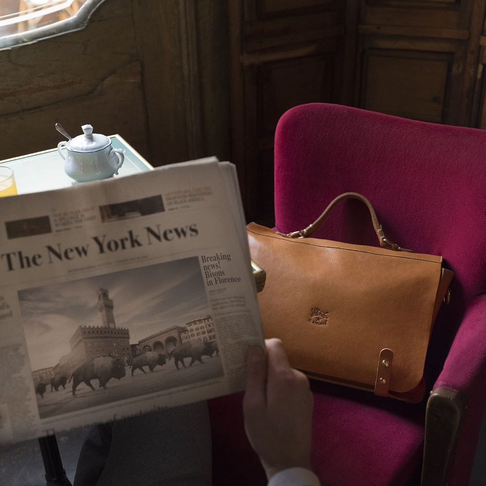 The bison has officially arrived. A man reads the news: he must go into the office, but he doesn’t seem to be worried. The man and the briefcase he holds fully embody the identity of Il Bisonte: Florentine by birth, international by vocation.