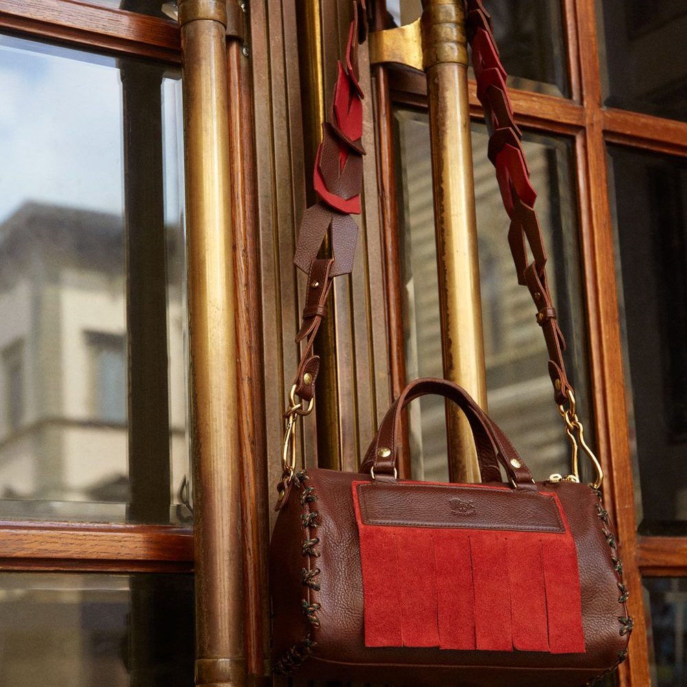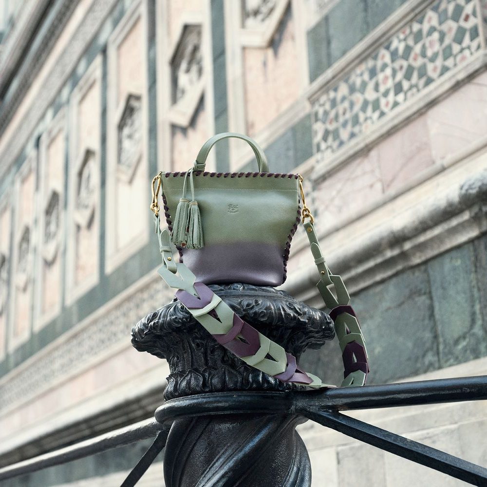 A bag in harmonious colors, that seems to have been lifted directly out of the façade of the Duomo of Florence, the city which has been the house of Il Bisonte since 1970.